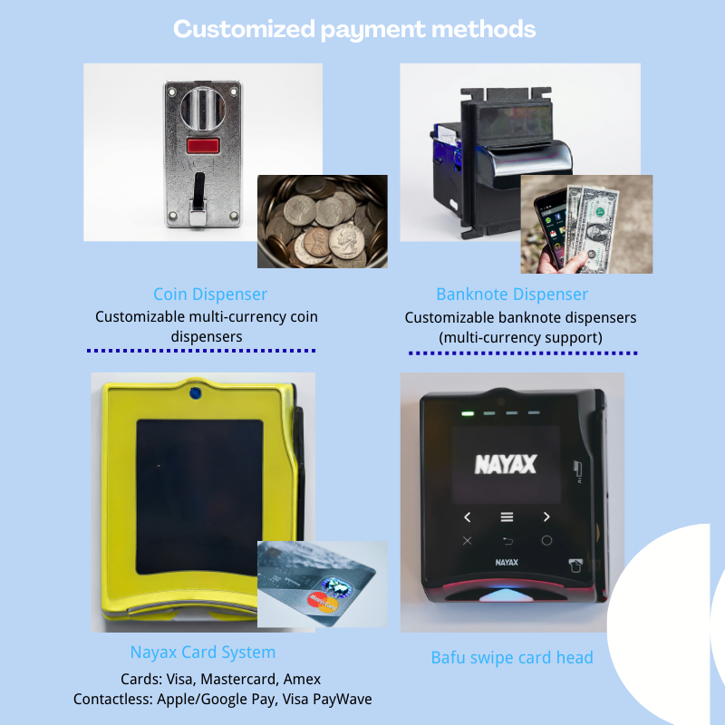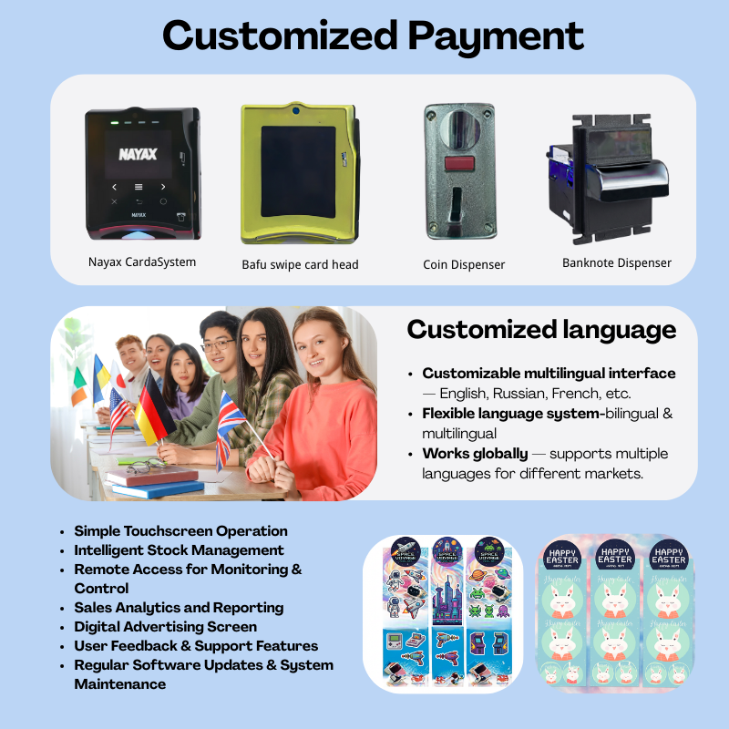 Made to Fit Your BusinessWe’ve delivered custom solutions to 100+ clients. From machine hardware to stickers and branding, payment method, language,everything can be adjusted to fit your exact needs.